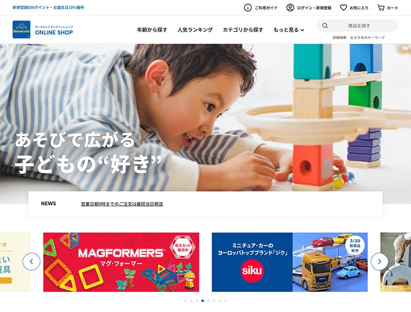 ”おもちゃ”ではなく子どもの生活道具として、世界の優れた「あそび道具」を提案するボーネルンド。オンラインショッピングサイトのリニューアルをお手伝いさせていただきました。